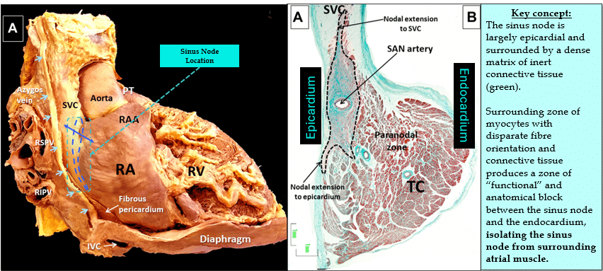 (Interestingly, when these “extensions” become diseased and non functional, we get SA nodal Exit Blocks, where the sinus node is disconnected from the atrial myocardium.)