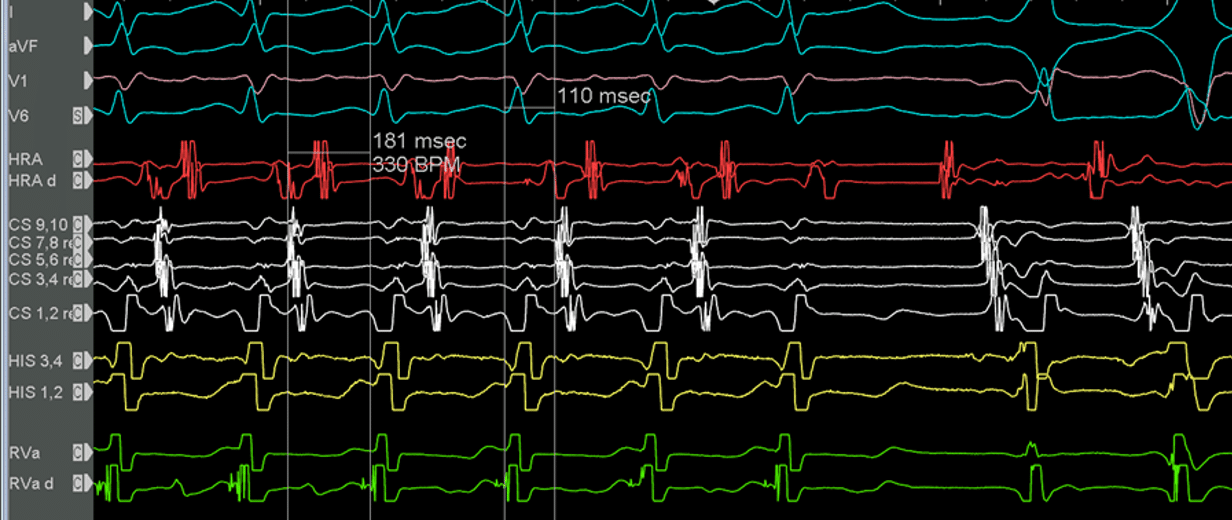 The Above EGM demonstrates a narrow complex tachycardia with a VA time of 110ms and eccentric atrial activation. This is strongly suspicious for ORT.
