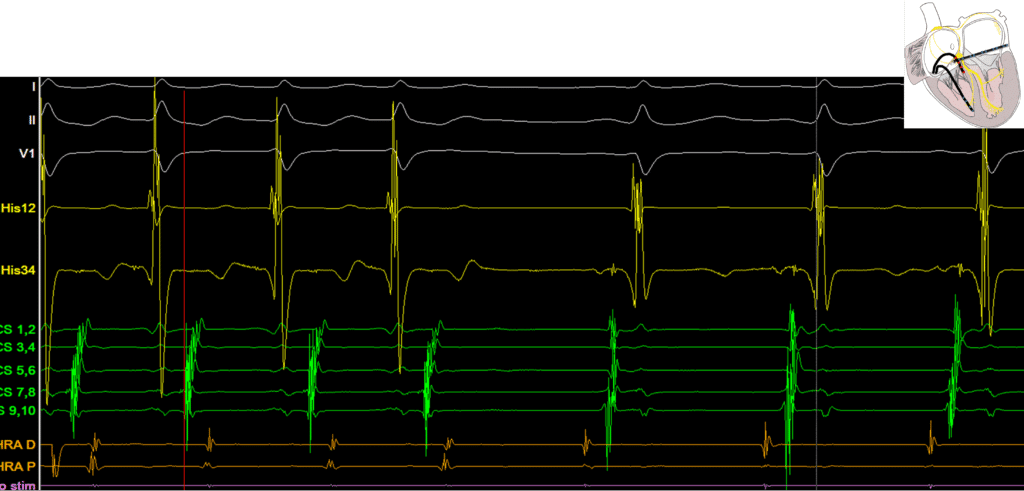 The Above EGM demonstrates a narrow complex tachycardia with a VA time of 110ms and eccentric atrial activation. This is strongly suspicious for ORT.